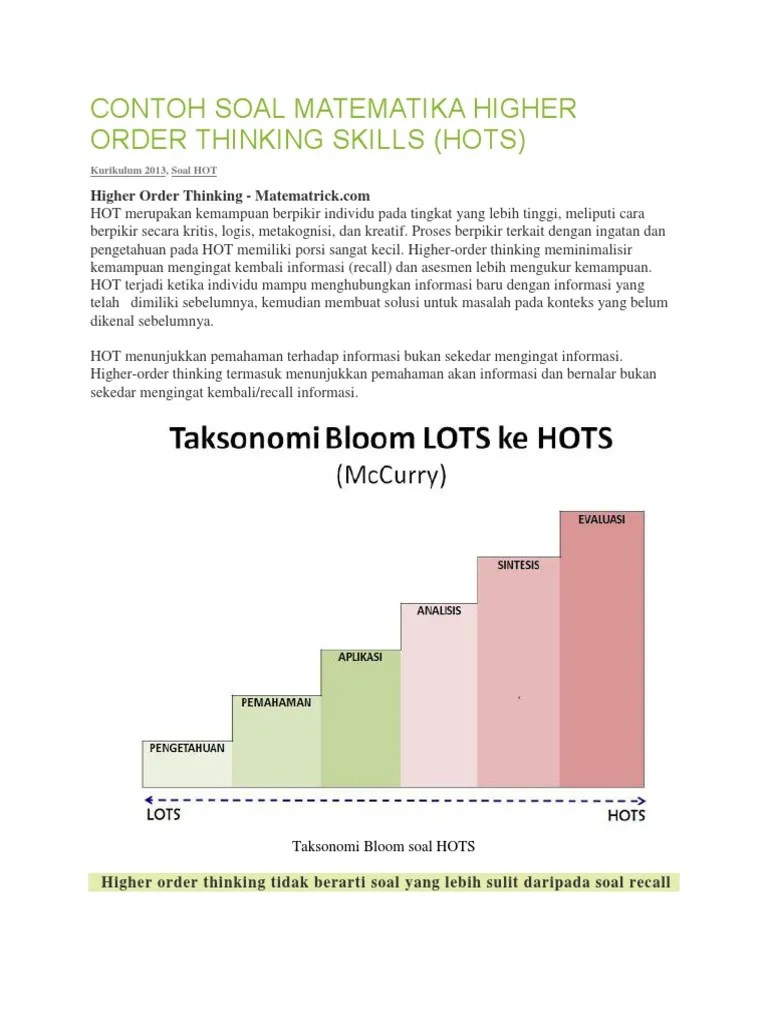 Soal hots sd menjadi salah satu soal yang paling sering dicari saat ini. Indonesia adalah negara yang majemuk, terdiri dari . Ketiga klasifikasi sebelumnya dinamakan dengan tipe soal lots (lower order thinking skills) atau kemampuan berpikir tingkat rendah. Level berpikir sedang atau mots (middle order thinking skill) terdiri atas. Lower order thinking skills (lots).